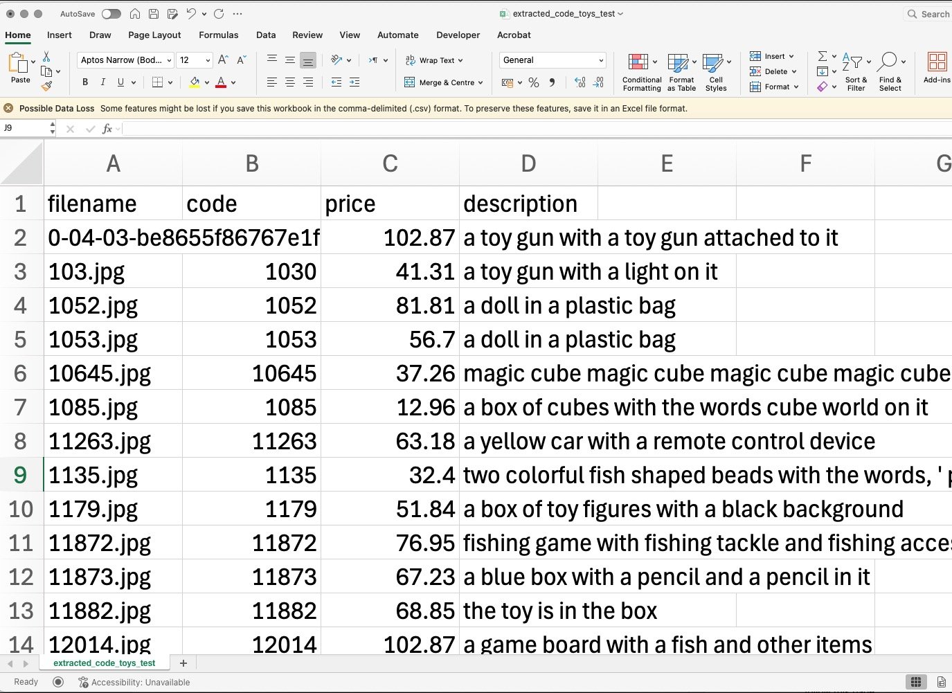 Raw view of the newly generated product database, showing extracted item codes, prices, and descriptions organized in a structured format.