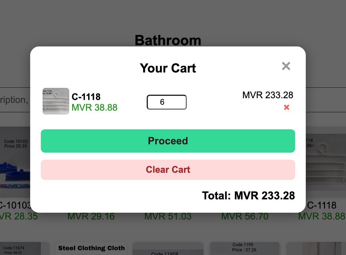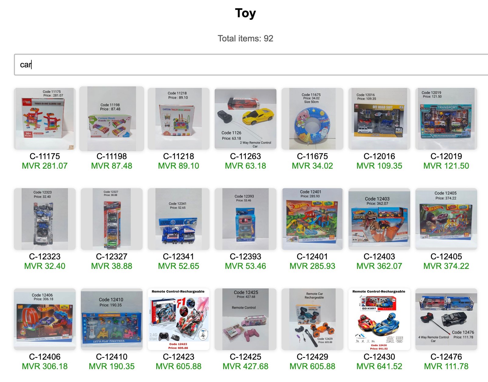 Search functionality in action: Customers can now quickly find products across categories using keywords or item codes.