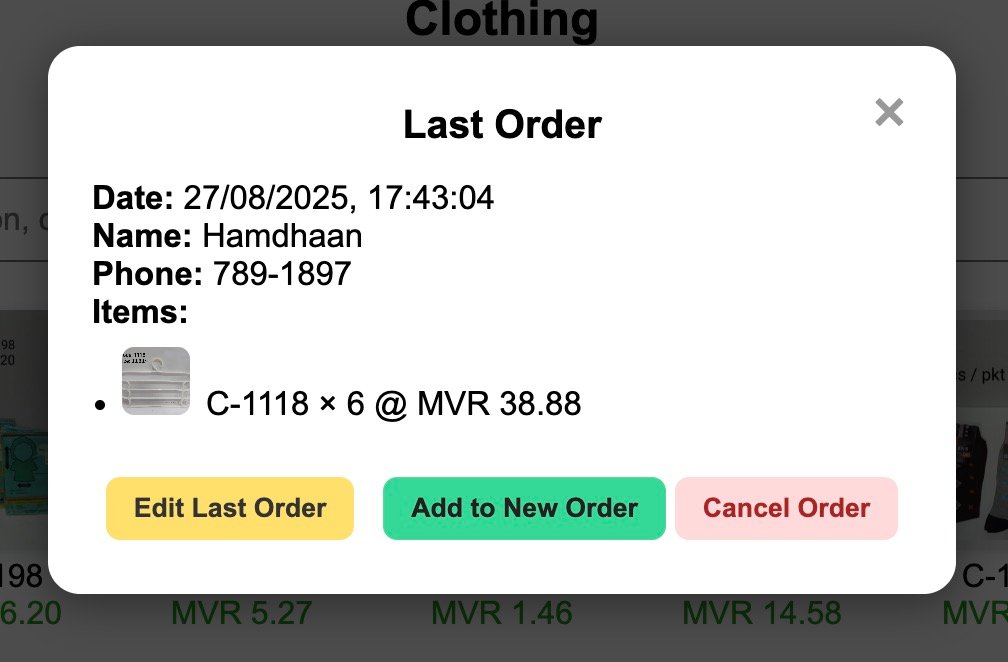 Edit order popup: Customers can review and update their previous order within 24 hours for added flexibility.