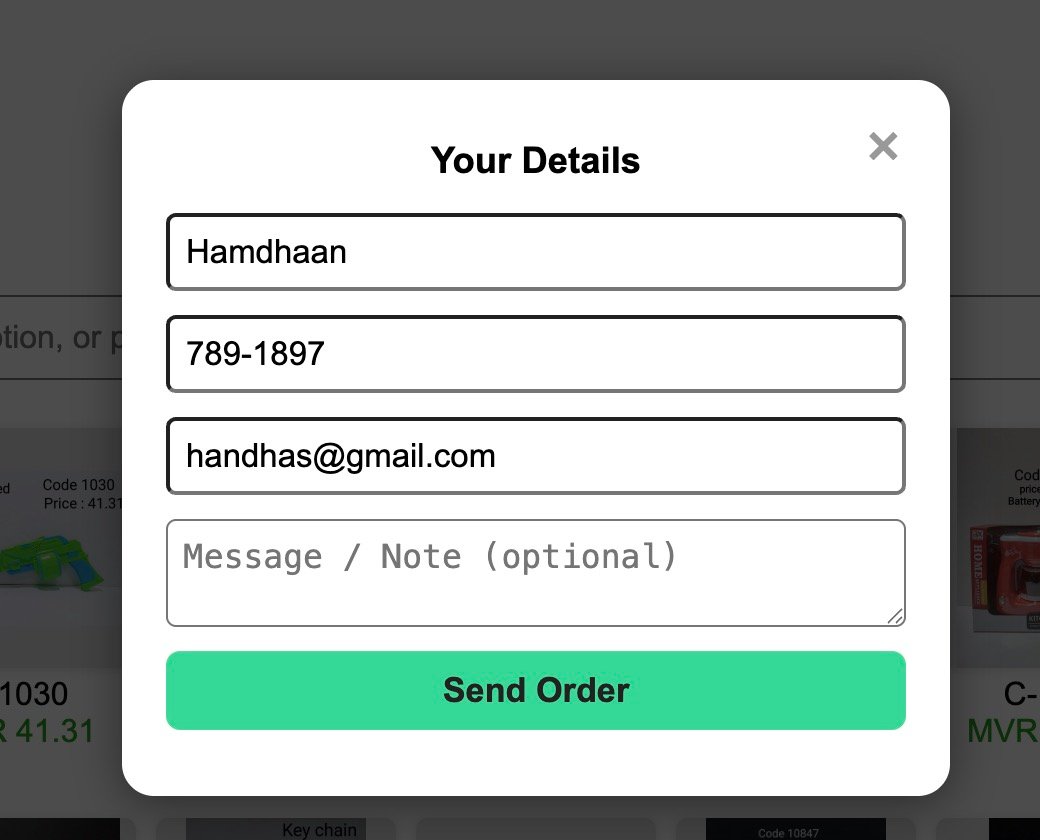 Contact details popup: A simple, user-friendly form for entering name and phone number—information is remembered for future orders.